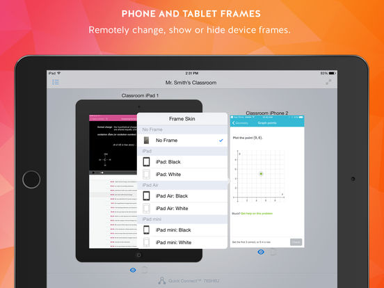 Select new device frames to display, or chose to hide frames all together. Displaying a frame around devices adds a polished and professional feel.