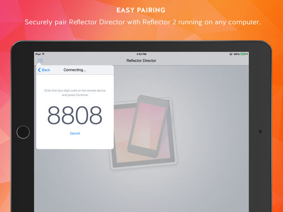 Pairing Reflector Director to Reflector 2 is easy and secure. The apps are paired directly together with no in-between connections. Use a Quick Connect Code (TM), QR Code or Bluetooth to easily pair.