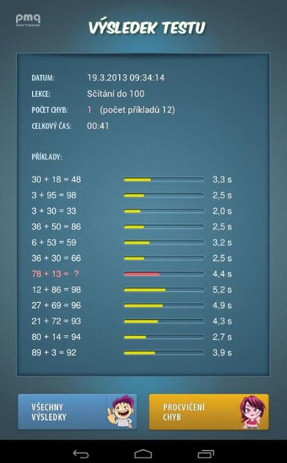 Uživateli se nabízí výuka, procvičování a test na čas. Program uchovává všechny výsledky testů na čas. Ve výsledcích jsou označeny chybné příklady a tyto příklady program nabídne ve speciálním režimu pro procvičování chyb (tlačítko procvičení chyb).