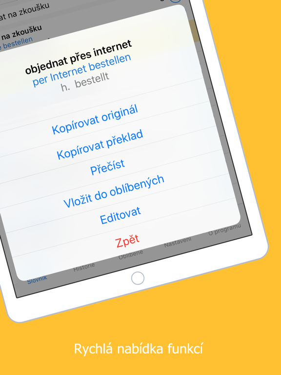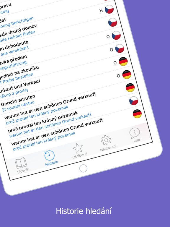 • Slovník umožňuje také výuku neznámých slov. Slova a slovní spojení, která ve slovníku označíte (vložíte do Oblíbených), se tak můžete učit s využitím pokročilého výukového algoritmu.