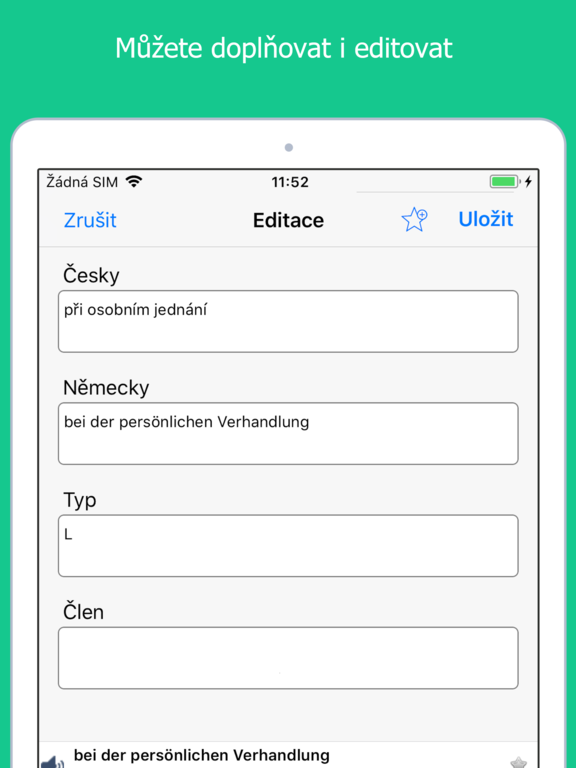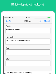 • Tento slovník je editovatelný! Do slovníku lze přidávat vlastní slova a poznámky a také editovat stávající slovní zásobu.