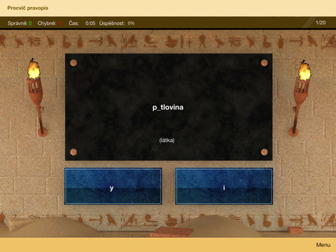 Aplikace obsahuje cvičení na procvičení českého pravopisu, která jsou rozdělena do pěti logických celků - na pravopis vyjmenovaných slov, velkých písmen, předpon s/z, pravopis skupin mě/mně, u/ú a na pravopis slov cizího původu. Aplikace obsahuje 261 slov či slovních spojení, počet cvičení poroste s dalšími aktualizacemi.