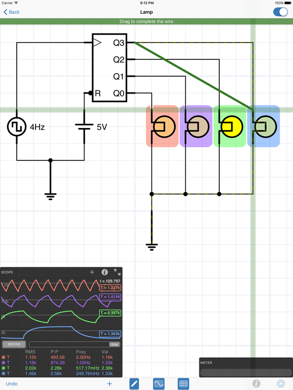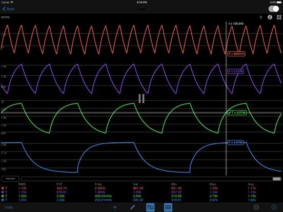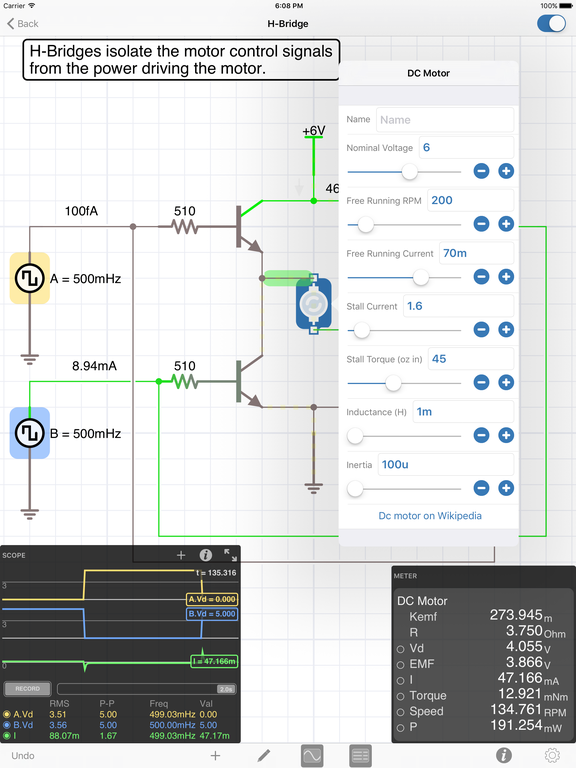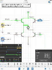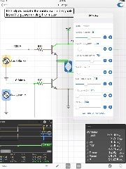 The app features a multimeter that you use to probe around the circuit to instantly read voltages and currents. If you want to see how a value changes over time, then you can add values to the built-in oscilloscope. The scope can simultaneously track many signals over time and features a touch interface to control the total time displayed and stacked and unstacked modes to easily compare signals.
