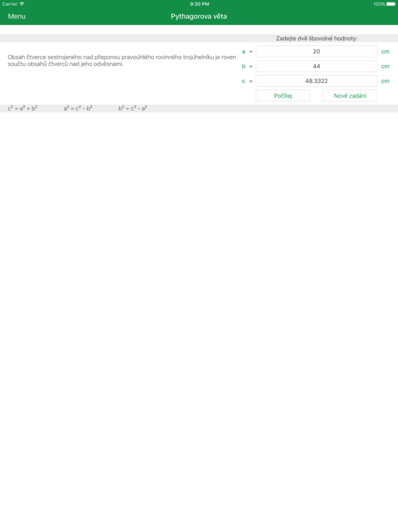 Jednoduchá uživatelsky přívětivá aplikace pro snadný výpočet matematických vzorců. S aplikací snadno vypočtete obvod, obsah, objem i povrch všech známých geometrických těles (například čtverec, trojúhelník, koule, válec atd.). Nechybí možnost vypočítat pythagorovu větu, goniometrické funkce, trojčlenku či procenta. Aplikace obsahuje také jednoduchou kalkulačku.