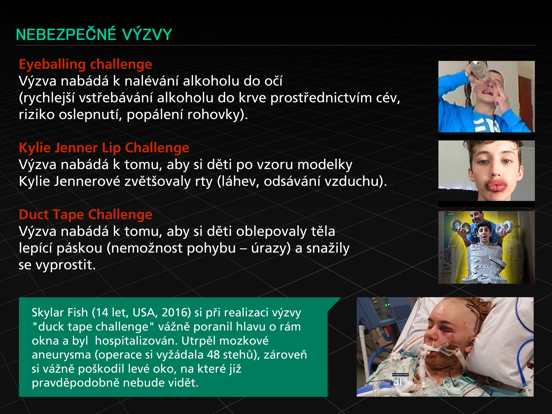 Aplikace E-Bezpečí seznamuje uživatele s rizikovými formami komunikaci v online prostředí. Zaměřuje se především na kyberšikanu, kybegrooming, sexting, webcam trolling, hoax, online výzvy a další rizikové fenomény.