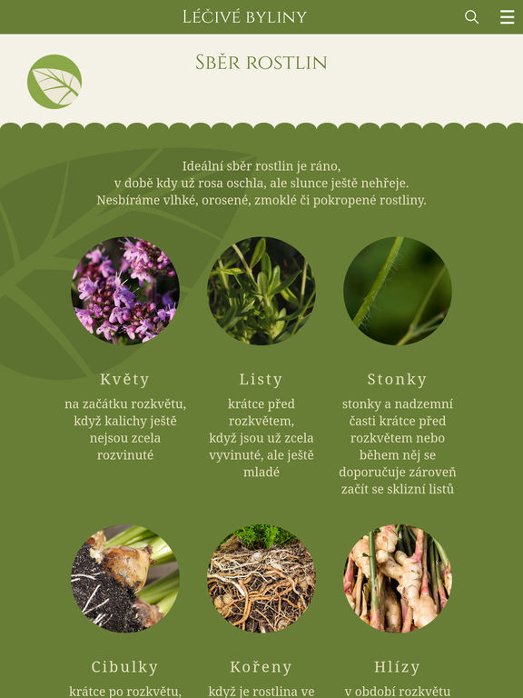 Aplikace je nejen herbář bylin, ale také obsahuje tipy a rady pro sběr a použití léčivých bylinek. Naleznete zde, na co působí jednotlivé bylinky, ale také obráceně, tj. na jakou nemoc je vhodné použít tu správnou léčbu (čaj, zábal, koupel).