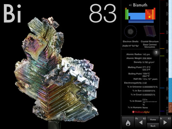 You start off at a living periodic table where every element is shown with a smoothly rotating sample. To read about tin, tap the tin soldier. To read about gold, tap the gold nugget. Immediately you see the sample filling nearly the entire screen, photographed to razor sharpness and rotating around a complete circle in front of your eyes. Beside that is a column of facts and figures, each of which can be tapped to bring up rich detail and current information through the embedded Wolfram|Alpha computational knowledge engine.
