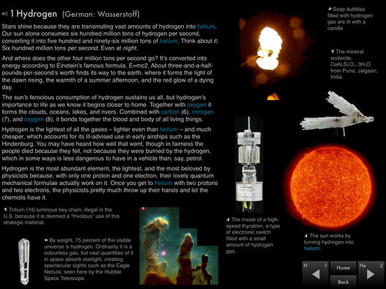 Touch the element name at the top of the page and you can see that element`s name in over a dozen different languages. Choose one and you`ll find that the entire book, stories, captions and all, switches to that language: The Elements includes both the full English original text and over a dozen full translations.