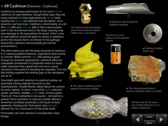 Go to each element`s second page and you find a fascinating story about the element, surrounded by carefully photographed objects representing it. Every one of these objects, well over 500 in total, is a freely rotatable, live object that you can examine from all sides and pinch zoom to see in unprecedented detail.