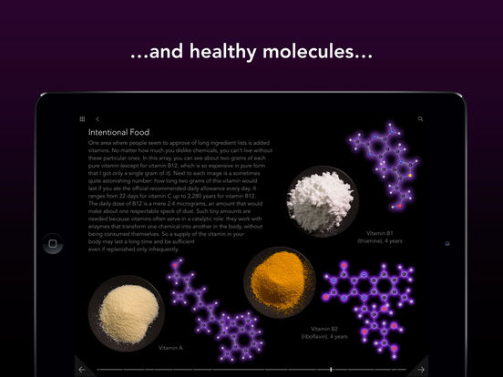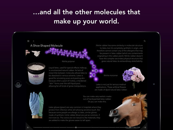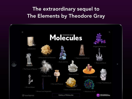 In addition to the amazing wiggling molecules, the app contains the entire book of Molecules, with all the objects interactively rotatable so you can see them from all sides. Going further than The Elements, the app includes dozens of innovative and intriguing `still life videos` that reveal the true nature of substances through close-up interactive video.