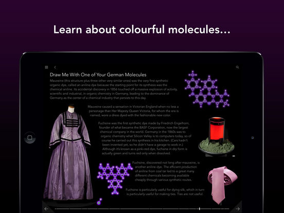 The app includes an important world first: a touch-interactive molecular dynamics simulation that lets you poke and prod hundreds of different molecules, seeing how each one reacts to your touch. Molecules are not static things – they twist, turn, vibrate, and spin in an elaborate and beautiful dance of quantum mechanics.