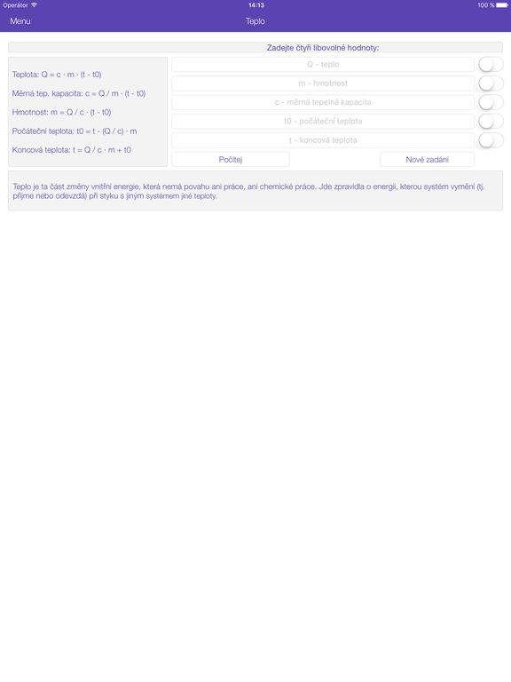 Jednoduchá uživatelsky přívětivá aplikace pro snadný výpočet fyzikálních vzorců. Aplikace obsahuje 17 základních fyzikálních vzorců (např. elektrický práce, tlak, archimédův zákon, teplo apod.) rozdělených do několika kategorií. U každého vzorečku nechybí ani dodatečné informace.