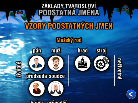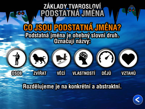 Aplikace se zaměřuje na procvičení a zafixování základních znalostí o podstatných jménech. Zaměřuje se na rozpoznávání podstatných jmen ve větách, určování pádů, životnosti, rozpoznávání správných tvarů apod.