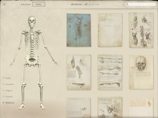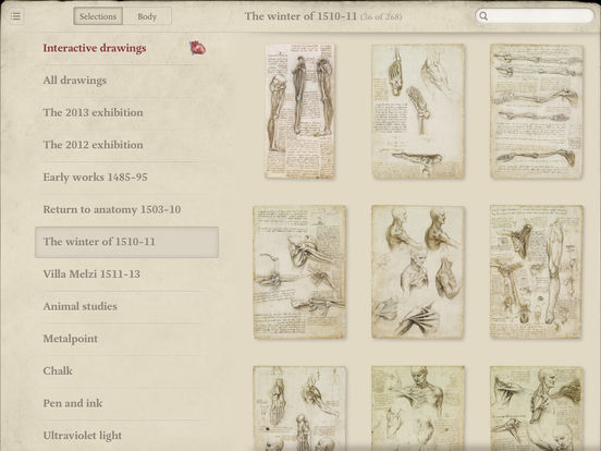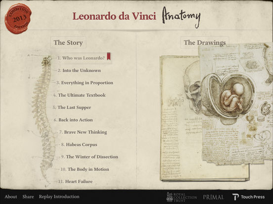 • Eleven story chapters, written by Martin Clayton, Senior Curator of Prints and Drawings at Windsor Castle, explaining Leonardo`s anatomical investigations and presenting over 70 selected works with interactive features