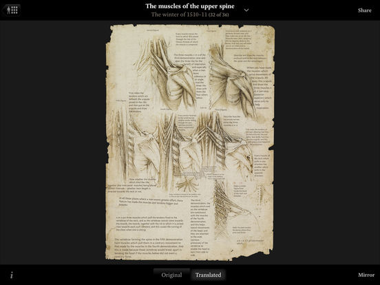 • Touch any of Leonardo`s extensive notes to read in situ a typeset English translation