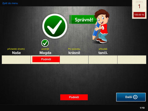 Aplikace je zaměřena na procvičování jednotlivých větných členů ve větách jednoduchých. K dispozici je sada úkolů pro procvičení větných členů (podmět, přísudek, přívlastek, předmět, příslovečné určení místa, času, způsobu, doplněk), samostatnou část tvoří trénink rozboru vět (přiřazování správného větného členu k příslušnému slovu ve větě). Aplikace statisticky vyhodnocuje úspěšnost plnění jednotlivých úkolů a vše zobrazuje na přehledném grafu.