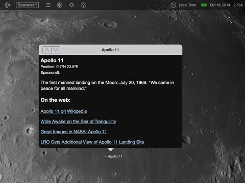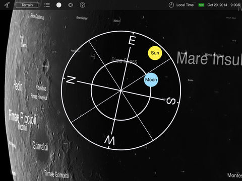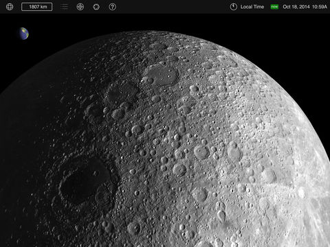 Use the multitouch screen to manipulate the view. Spin above the surface, or switch to Telescope mode to see the Moon as it appears from your location on Earth. Adjust the display time and watch the sunlight shift over the lunar landscape. A "tag cloud" floats just above the surface, labeling terrain features and spacecraft; touch any label to find out more about that feature. Moon Globe also shows you where the Moon and Sun are in the sky with its dynamic sky compass.