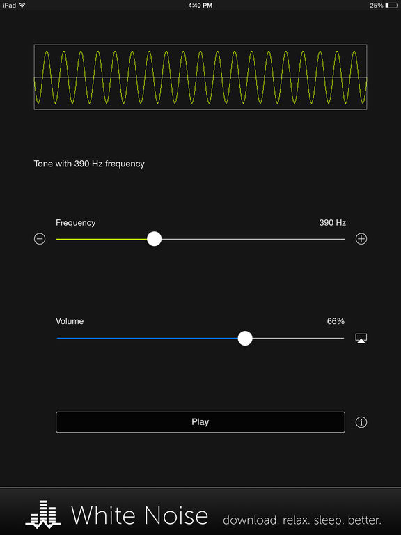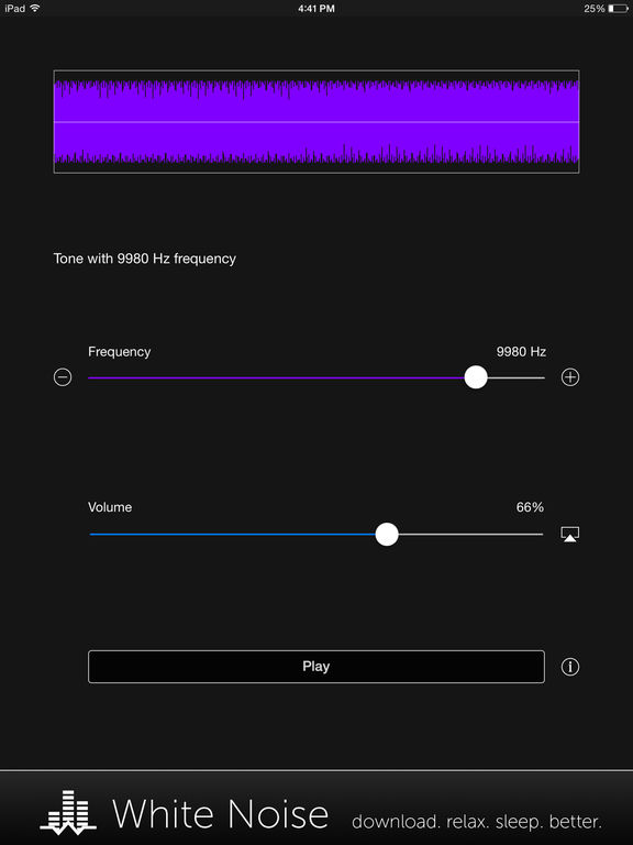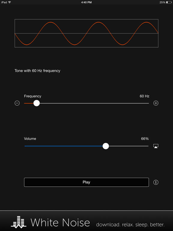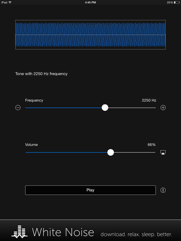 Adjust audio frequency by dragging the slider or tapping the plus/minus buttons. Adjust device volume using the on-screen volume slider. You can also specify to play audio to any AirPlay supported device. Toggle audio playback using the Play/Pause button.